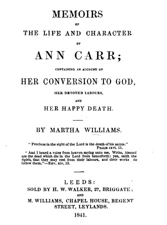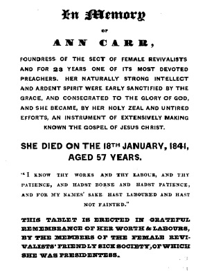 The ‘Leeds Times’ – perhaps with a little irony – said she was ‘a woman of extraordinary firmness and decision of character; possessing talents which fall to the lot of very few of the more gentle sex.’ Ann Carr preached without notes with ‘simplicity, perspicuity and force; she often gave utterance to the most thrilling and overpowering evidence.’ She told anyone she could about the Gospel including door to door evangelism an whoever she happened to be sitting next to while travelling; she rode a horse, which was rained to stop whenever it saw a group of workmen at the roadside so she could talk to them.